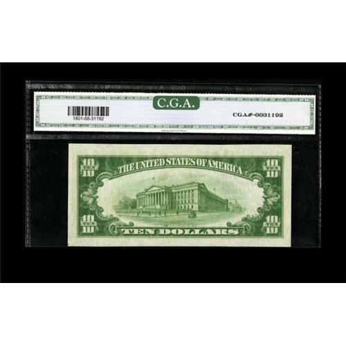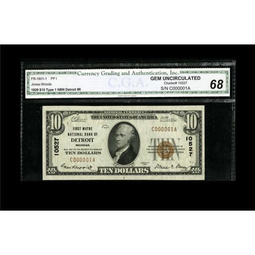<B>Detroit, MI</B></I> - $10 1929 Ty. 1 <B>First Wayne NB</B></I> Ch. # 10527<BR> This note from all appearances looks like a presentation piece of some type as great care was taken to ensure large margins. The note's cut gives the impression of being very similar to the three notes from the Grinnell presentation set sold in our 2006 FUN auction. Replacement serial numbers are also noticed which is very interesting and eye appealing. These are verified by the unevenness of the numbers and the lightness of them as they were applied by hand. <B>CGA Gem Uncirculated 68</B></I>.<BR><BR><b>Shipping:</b> Coins & Currency (<a target="_blank" href="http://www.heritageauctions.com/common/shipping.php">view shipping information</a>)