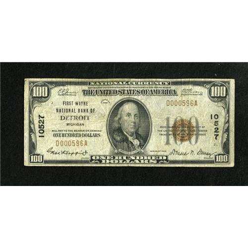 <B>Detroit, MI</B></I> - $100 1929 Ty. 1 <B>First Wayne NB</B></I> Ch. # 10527<BR>A light dusting of circulation soil does little to hide the surfaces of this pleasing high denomination from the Motor City. <B>Very Good-Fine.</B></I><BR><BR><b>Shipping:</b> Coins & Currency (<a target="_blank" href="http://www.heritageauctions.com/common/shipping.php">view shipping information</a>)