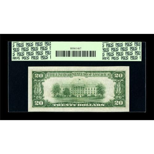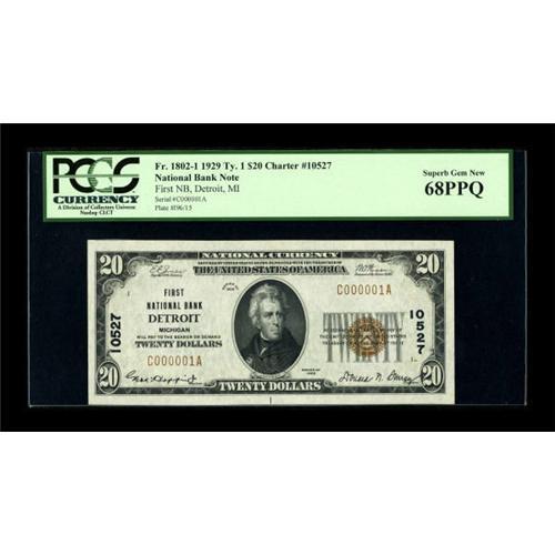 <B>Detroit, MI</B></I> - $20 1929 Ty. 1 <B>First & Old NB</B></I> Ch. # 10527<BR> This <B>PCGS Superb Gem New 68PPQ</B></I> piece is a perfect match to a trio of $5 pieces in our FUN 2006 Signature Auction. The $5 notes were sold as part of an extraordinary serial number 1 presentation set with a long and illustrious pedigree. Previously the notes, including this one, were part of a single lot in the Grinnell Collection presented by Barney Bluestone. The lot included the $5, $10, $20, $50, and $100 Type 1, Serial Number 1 sheets. The history of the sheets was included in our 2006 description, "The set first reached the collecting fraternity when they were obtained by Albert A. Grinnell, a pioneer currency collector who was a Detroit businessman, and who, during the 1930's and 1940's, formed the largest and most complete collection of U.S. currency ever assembled. When Grinnell's holdings were sold in a series of auctions from 1944 through 1946, these notes were obtained from those sales by the National Bank of Detroit, which placed them on display in its money museum, which became one of Detroit's leading tourist attractions in its heyday. Several years ago the bank was purchased by Bank One, and the museum was closed in a cost cutting move by the new owners. The collection was consigned to a local auctioneer, Craig Whitford of Lansing, and sold at a Michigan State Numismatic Society show." The C000001A $5 example also graded 68PPQ realized $9,200. With a matching serial number and the near-perfect state of preservation, we expect this piece will realize...<BR><BR><b>Shipping:</b> Coins & Currency (<a target="_blank" href="http://www.heritageauctions.com/common/shipping.php">view shipping information</a>)
