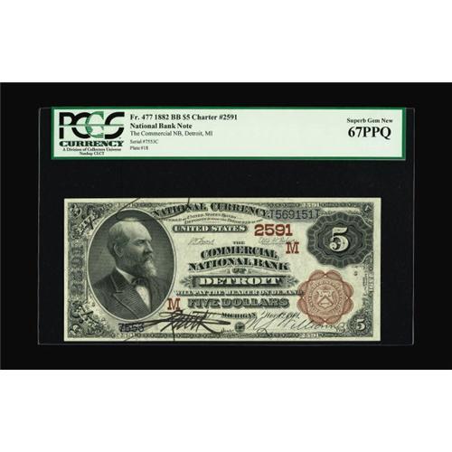 <B>Detroit, MI</B></I> - $5 1882 Brown Back Fr. 477 <B>The Commercial NB</B></I> Ch. # (M)2591<BR>Most of the uncirculated Brown Backs from Michigan come to the collecting fraternity through the First National Exchange Bank of Plymouth, with this premium example from Detroit being one of a small handful of $5 Brown Backs documented in the Kelly census from here as "CU." This example is clearly all that and more, with the accolades of its certified grade of <B>PCGS Superb Gem New 67 PPQ</B></I> obvious to even the most inexperienced collector. This is the type of note one should view if only for the educational value of seeing first hand what the virtual perfection of the 67 grade should look like. The paper is clearly as bright and original as the day this note was printed and the exceptional embossing is visible even through the encapsulation surfaces. Plan on a strong bid for this beautiful note, as the competition should be fierce and unrelenting in today's quality driven market.