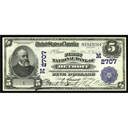 <B>Detroit, MI</B></I> - $5 1902 Date Back Fr. 590 <B>The First NB</B></I> Ch. # (M)2707<BR>Despite the existence of the massive Grinnell collection of Michigan Nationals, which was assembled by a Detroit resident over a two decade period from the 1920's through the 1940's, no serial number one examples of any kind have ever been seen from this Detroit institution until the appearance of this specimen in tonight's sale. As the "A" plate note on the sheet, it is truly the "first" Date Back issued from here, and very likely wound up as a family keepsake. While it likely never saw any real circulation, there are a few storage folds acquired over the years, none of which detract one whit from the appeal of this bright and attractive specimen. <B>Extremely Fine,</B></I> a significant new discovery worthy of the finest of collections.