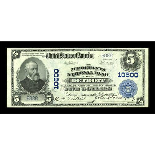 <B>Detroit, MI</B></I> - $5 1902 Plain Back Fr. 605 <B>The Merchants NB</B></I> Ch. # 10600<BR> A fully embossed beauty with bright white paper and total originality. While we are only able to trace the pedigree of this lovely note back to a 1979 Kagin sale, we strongly suspect that it comes from the Grinnell holdings, as the fancy serial number 8888 and the Detroit location (Mr. Grinnell was a resident of that city), along with the fact that the three other 8888 notes from this sheet are known add up to very compelling evidence. <B>Choice Crisp Uncirculated.</B></I><BR><I>From The Warren Marshall Collection</B></I><BR><BR><b>Shipping:</b> Coins & Currency (<a target="_blank" href="http://www.heritageauctions.com/common/shipping.php">view shipping information</a>)