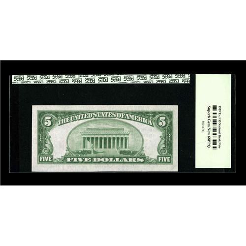 <B>Detroit, MI</B></I> - $5 1929 Ty. 1 <B>First NB in Detroit</B></I> Ch. # 10527<BR>The first of three pieces in what is an extraordinary serial number 1 presentation set with a long and illustrious pedigree. These pieces first reached the collecting fraternity when they were obtained by Albert A. Grinnell, a pioneer currency collector who was a Detroit businessman, and who, during the 1930's and 1940's, formed the largest and most complete collection of U.S. currency ever assembled. When Grinnell's holdings were sold in a series of auctions from 1944 through 1946, these notes were obtained from those sales by the National Bank of Detroit, which placed them on display in its money museum, which became one of Detroit's leading tourist attractions in its heyday. Several years ago the bank was purchased by Bank One, and the museum was closed in a cost cutting move by the new owners. The collection was consigned to a local auctioneer, Craig Whitford of Lansing, and sold at a Michigan State Numismatic Society show. Fortunately for this generation of collectors, the set, representing one serial number one note from each of this bank's issuing titles in small size, remained together as each of the three items was obtained there by our consignor. Looking at each of these notes, it's very obvious that each note was specially cut from the serial number one sheets for Mr. Grinnell, as the margins on every side are huge, running right into the frame line of the notes above. PCGS obviously agrees that each piece offered here is extraordinary as well, grading this piece as <B>Superb Gem New 68 PPQ.</B></I> Whatever the realization here, which is certain to be considerable, it is our fervent hope that the successful bidder tonight will keep this historically significant set together for future generations to marvel at.