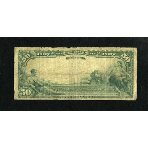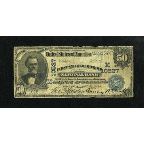 <B>Detroit, MI</B></I> - $50 1902 Date Back Fr. 674 <B>First & Old NB</B></I> Ch. # (M)10527<BR> This is a decent high denom for the grade with bold printed signatures. There are some aberrations in the margins. <B>Good-Very Good.</B></I><BR><BR><b>Shipping:</b> Coins & Currency (<a target="_blank" href="http://www.heritageauctions.com/common/shipping.php">view shipping information</a>)