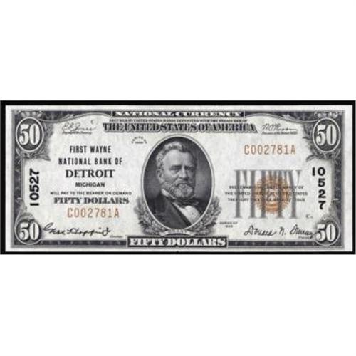 Detroit, MI. $50 1929 Ty. 1. First Wayne NB. Charter #10527. PMG Choice Uncirculated 63EPQ.