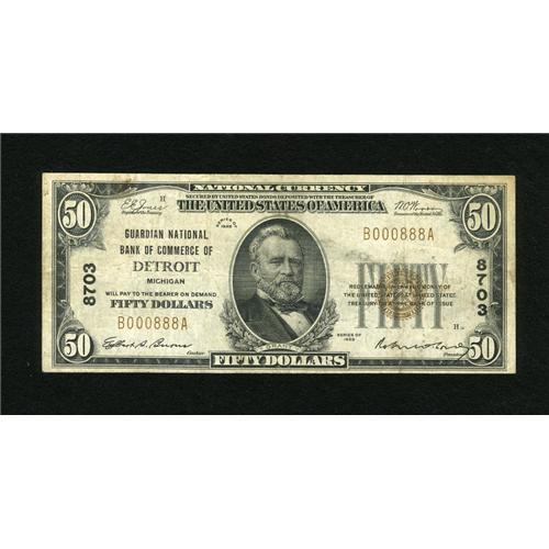 <B>Detroit, MI</B></I> - $50 1929 Ty. 1 <B>Guardian NB of Commerce</B></I> Ch. # 8703<BR>This $50 boasts the serial number B000888A. <B>Fine-Very Fine.</B></I><BR><BR><b>Shipping:</b> Coins & Currency (<a target="_blank" href="http://www.heritageauctions.com/common/shipping.php">view shipping information</a>)
