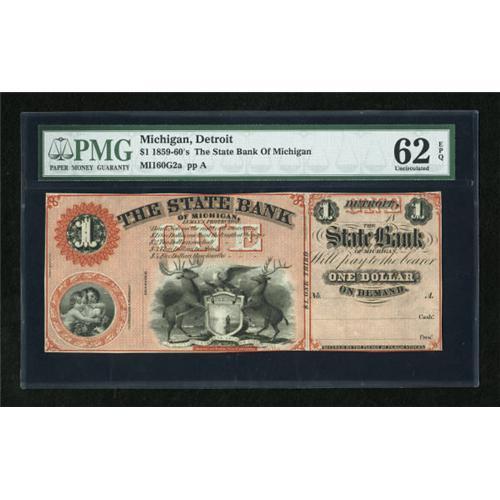 <B>Detroit, MI- State Bank</B></I> $1 18__<BR> This bank was in business from 1859 - 1864. In 1864, this bank became the First National Bank of Detroit, charter number 97. <B>PMG Uncirculated 62 EPQ.</B></I><BR><BR><b>Shipping:</b> Coins & Currency (<a target="_blank" href="http://www.heritageauctions.com/common/shipping.php">view shipping information</a>)