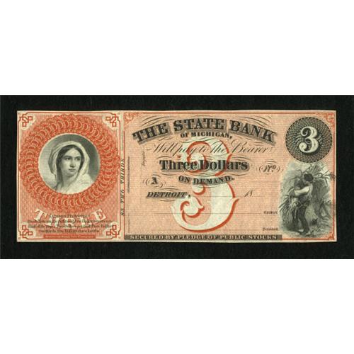 <B>Detroit, MI- State Bank </B></I>$3 18__ G6a<BR> An attractive remainder with a lone corner tip fold accounting for the grade. <B>Choice About Uncirculated. </B></I><BR><I>From The Collection of a Louisiana Gentleman</B></I><BR><BR><b>Shipping:</b> Coins & Currency (<a target="_blank" href="http://www.heritageauctions.com/common/shipping.php">view shipping information</a>)