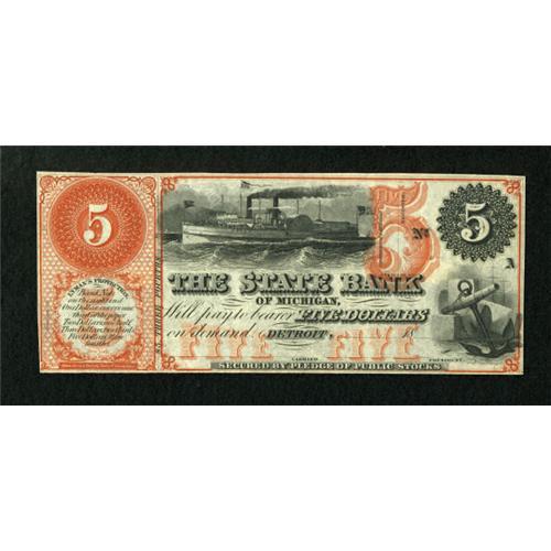 <B>Detroit, MI- State Bank of Michigan </B></I>$5 18__ G8a<BR> Here is a scarce ABNCo. remainder utilizing the Lyman Protector method to combat counterfeiting. This example was once mounted. <B>Choice About Uncirculated.</B></I><BR><I>From The Collection of a Louisiana Gentleman</B></I><BR><BR><b>Shipping:</b> Coins & Currency (<a target="_blank" href="http://www.heritageauctions.com/common/shipping.php">view shipping information</a>)