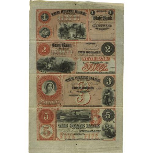 <B>Detroit, MI- The State Bank of Michigan </B></I>$1-$2-$3-$5 18__ G2a-G4a-G6a-G8a Uncut Sheet<BR> There are folds between the notes and in the top and bottom selvage. These were the only notes issued by this bank and it became the First National Bank of Detroit in 1863, charter number 97. <B>Very Fine</B></I>.<BR><BR><b>Shipping:</b> Coins & Currency (<a target="_blank" href="http://www.heritageauctions.com/common/shipping.php">view shipping information</a>)
