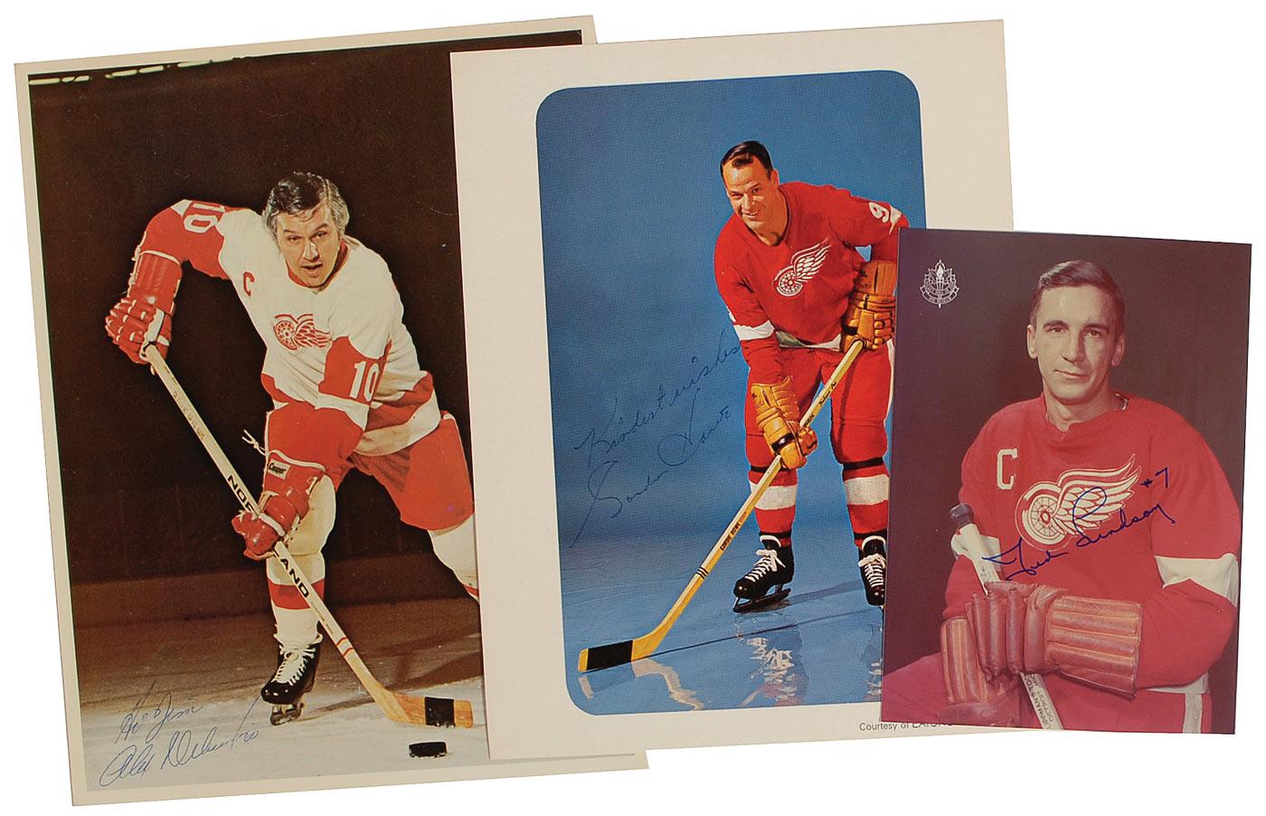 Three photos, various finishes, ranging in size from 5 x 7 to 8.5 x 10.5, each signed in ink or felt tip by the respective Detroit star pictured. Signers are: Gordie Howe (adding “Kindest wishes”), Ted Lindsay (adding “7”), and Alex Delvecchio (ins). In overall fine condition with surface scuffing to the Delvecchio photo beneath his signature.