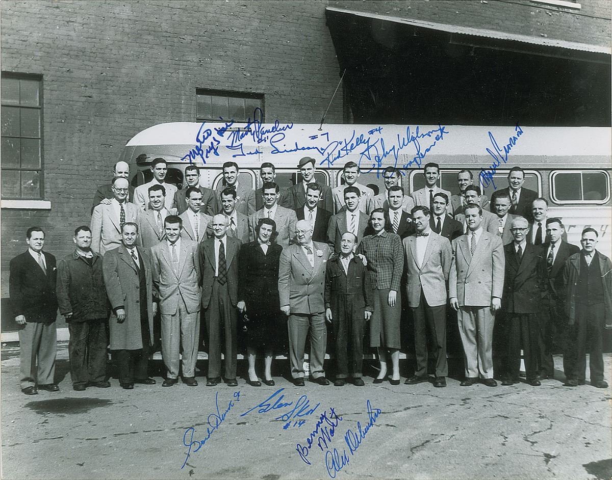Satin-finish 14 x 11 photo of the champion Detroit Red Wings team with their bus, signed in blue felt tip by eleven players, many of them in the Hockey Hall of Fame, including: Gordie Howe, Ted Lindsay, Red Kelly, Alex Delvecchio, Marcel Pronovost, Glen Skov, Benny Woit, Johnny Wilson, Metro Prystai, Tony Leswick, and Marty Pavelich. In fine condition. Accompanied by a ticket to the signing at which Howe autographed this photo.