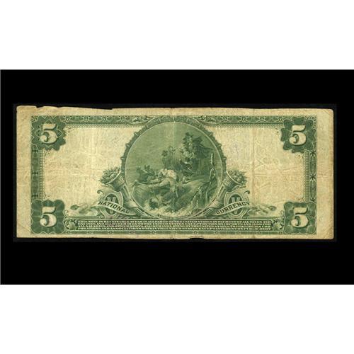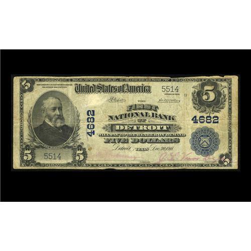 <B>Detroit, TX</B></I> - $5 1902 Plain Back Fr. 601 <B>The First NB</B></I> Ch. # 4682<BR>This was the only bank to issue in this tiny NE Texas community before bowing out in January of 1929. The census shows just five notes extant, which is somewhat deceptive considering that two of the five are impounded in the Philpott/Moody holdings. Our data shows just two offerings of any kind from here during the past sixty years, with this bank and town missing from every major collection offered in the past ten years, including Everson, Irish, Ivy, and Permian Basin. <B>Fine+.</B></I>