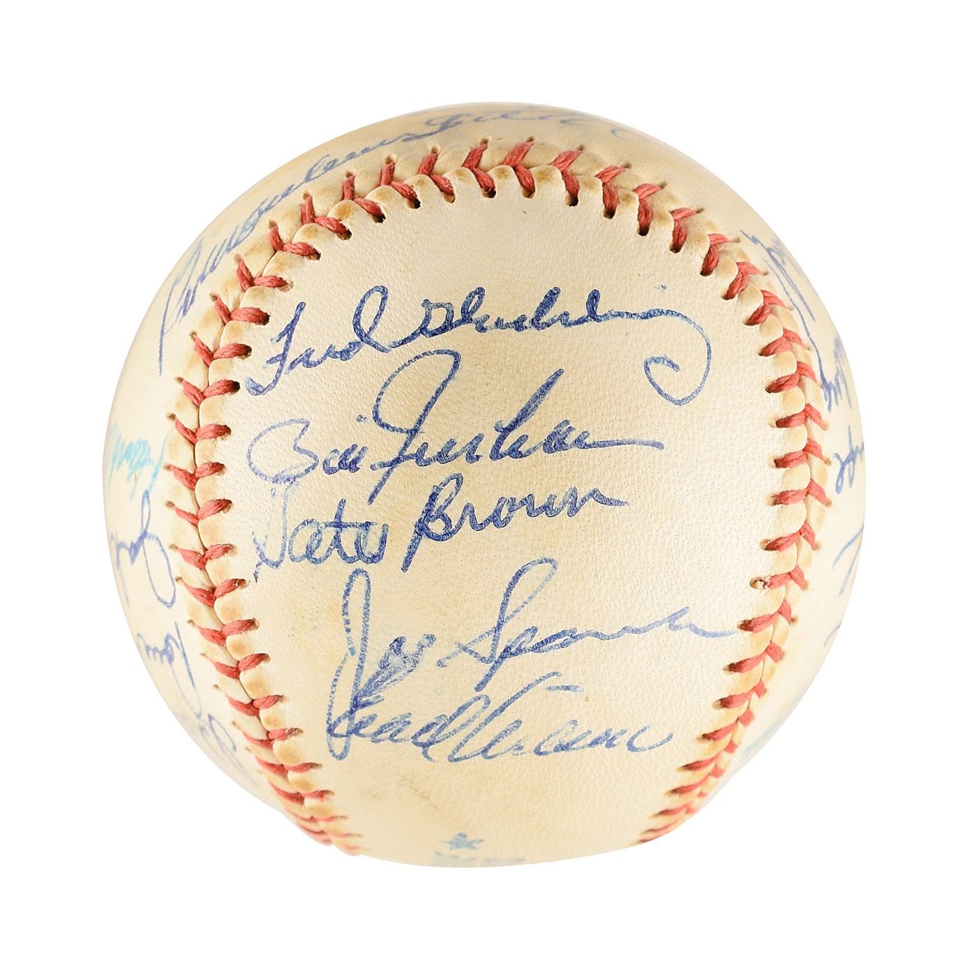 Official "Regulation League, Cleveland Indians" baseball signed in blue ballpoint on the sweet spot and side panels by 24 members of the 1966 Detroit Tigers, including: Al Kaline, Mickey Lolich, Stubby Overmire (ss), Bill Freehan, Gates Brown, Joe Sparma, Fred Gladding, Pat Mullin, Mike Roarke, Jim Northrup, Don Wert, Willie Horton, Larry Sherry, Dave Wickersham, Jake Wood, Orlando Pena, Hank Aguirre, Frank Skaff, Dick McAuliffe, Jerry Lumpe, and others. In very good to fine condition, with scattered light staining, and Overmire's signature traced over.