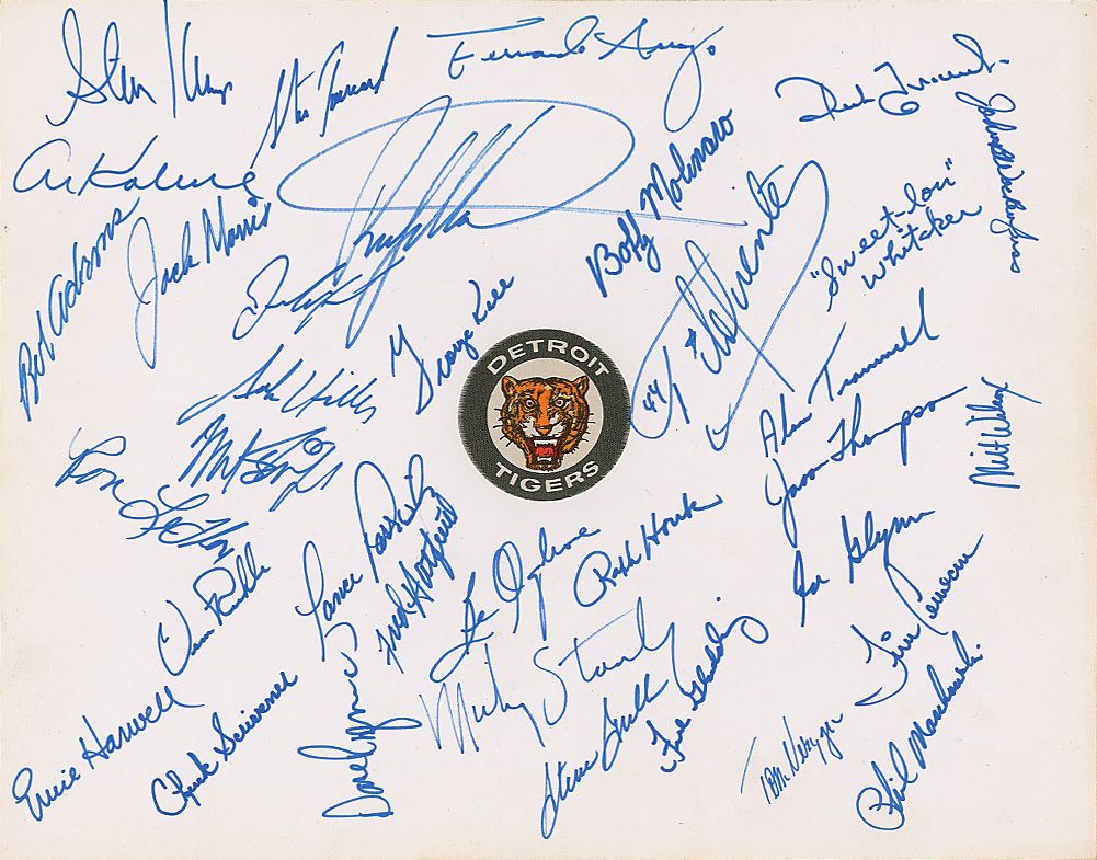 Thirty-two felt tip signatures from the 1970s Detroit Tigers on an off-white 14 x 11 cardstock sheet with a Tigers logo affixed to the center. Signers include: Al Kaline, George Kell, Jack Morris, Lou Whitaker, Ernie Harwell, Lance Parrish, and Alan Trammell. In fine condition, with light toning to the borders.