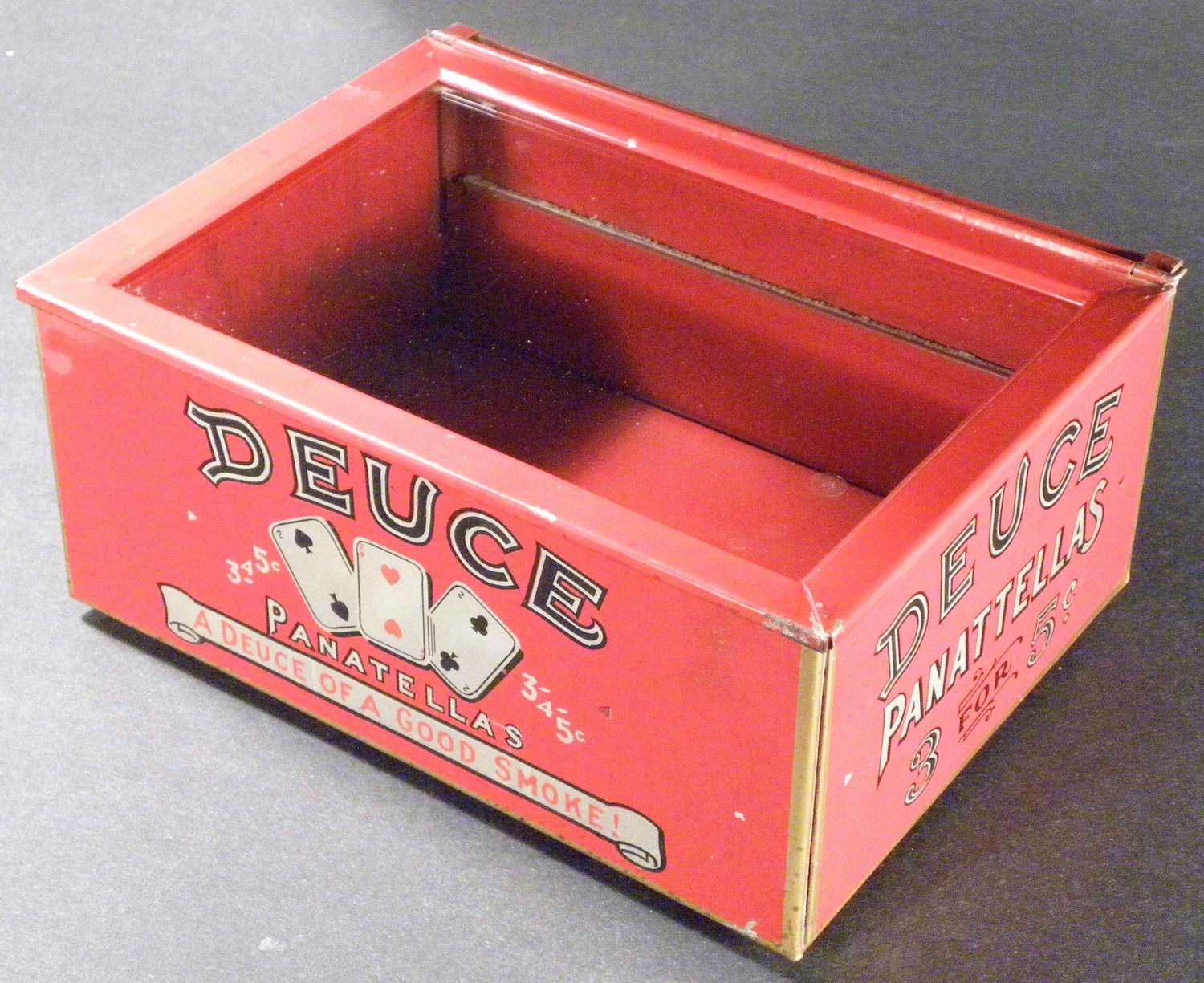 Deuce Panatela's Cigar Tin Store Display. Glass lid with tin litho sides. Excellent condition. 9 1/4 X 7 X 4 inches. Starting bid $70