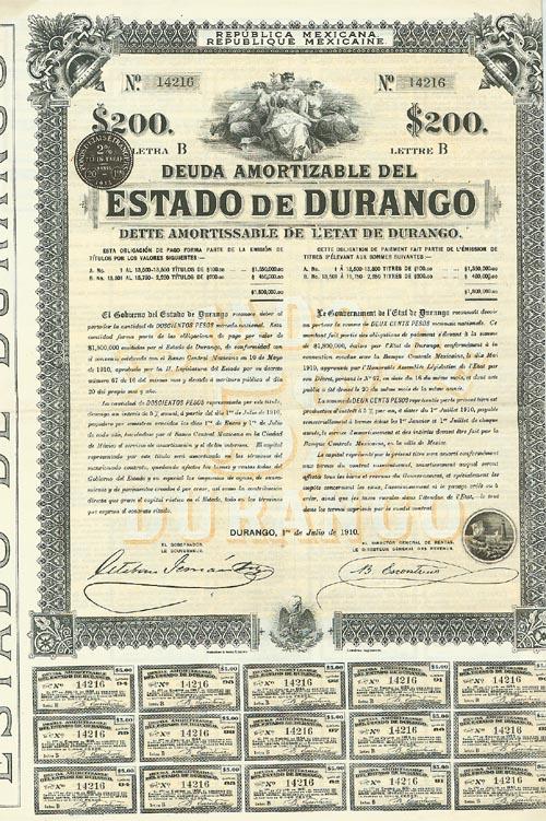 1910, Mexico. $200 bond . Black. Small vignette a top center of three female allegorical figures. Extremely Fine.