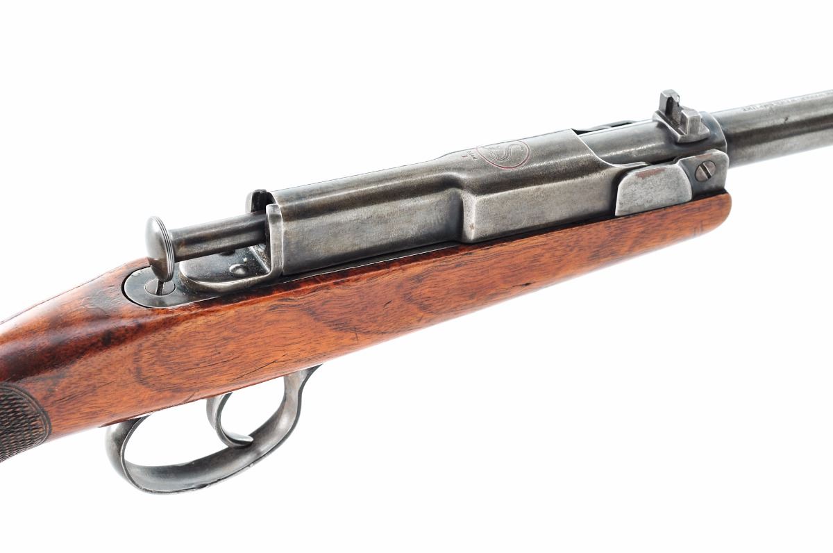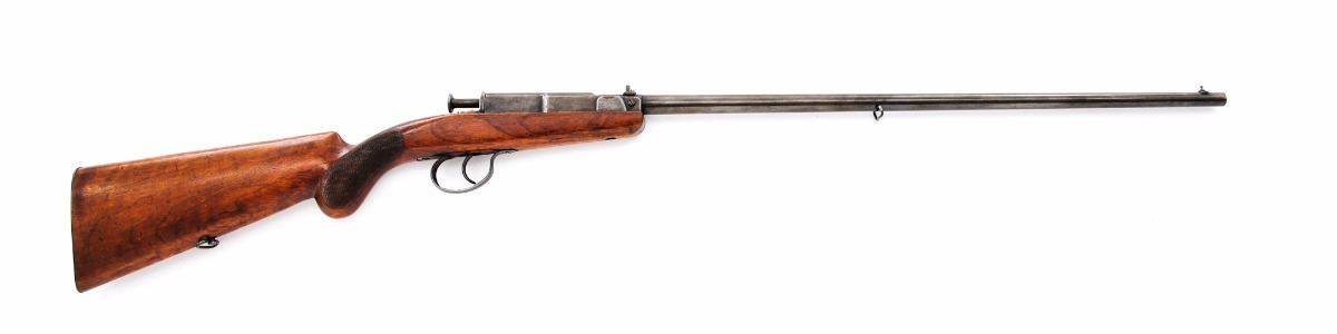 Deutsche Werke Erfurt Model 1 Single Shot Rifle, mfg'd by Deutsche Werke, Erfurt, Germany, #3154A, .22 LR cal., 23'' round tapered barrel, blue finish, tip-up breech for loading and ejecting shells, with bolt pull for cocking and safety; checkered round knob pistol-grip walnut stock with raised Deutsche Werke logo to left side of stock, original steel buttplate with Deutsche Werke logo, sling swivels, silver bead front sight and notched rear sight. Right hinge plate is stamped ''D.R.P./Germany''; factory logo and ''Mod. / 1'' at breechblock; ''(crown)/B'' and other proofmarks on barrel and receiver. Condition is near fine retaining approx. 70% thinning blue. Stock shows normal signs of age and wear including scattered moderate scratches and impressions, and appears to have an additional coat of varnish added. Tip-up action operates smoothly and remains tight. Bore is excellent. Est.: $200-$400. (C&R)