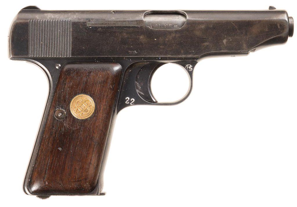 Seen in limited quantities, the button safety is associated with military and police contract production. With "8(Rampant Lion)4" on the slide and "22" and "CRS" on the trigger guard. With a brown leather flap holster.