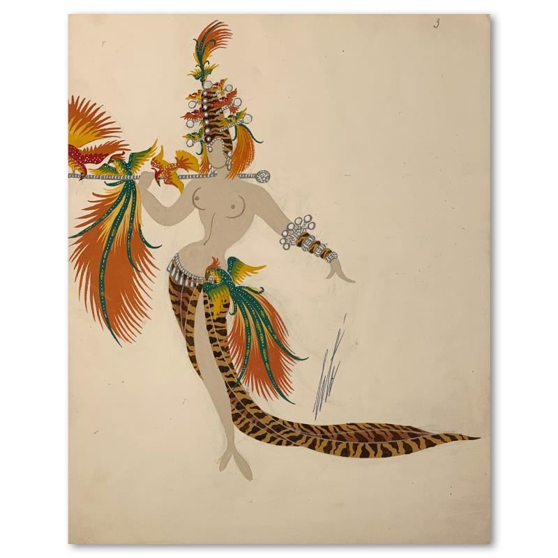 "Deuxieme porteuse d'oiseaux" is an original gauche painting on paper by Erte (1892-1990), hand signed by the artist. This piece bears the stamp, title and registration number 15.453 inverso. Includes Letter of Authenticity. Measures approx. 10.5" x 14.5".
