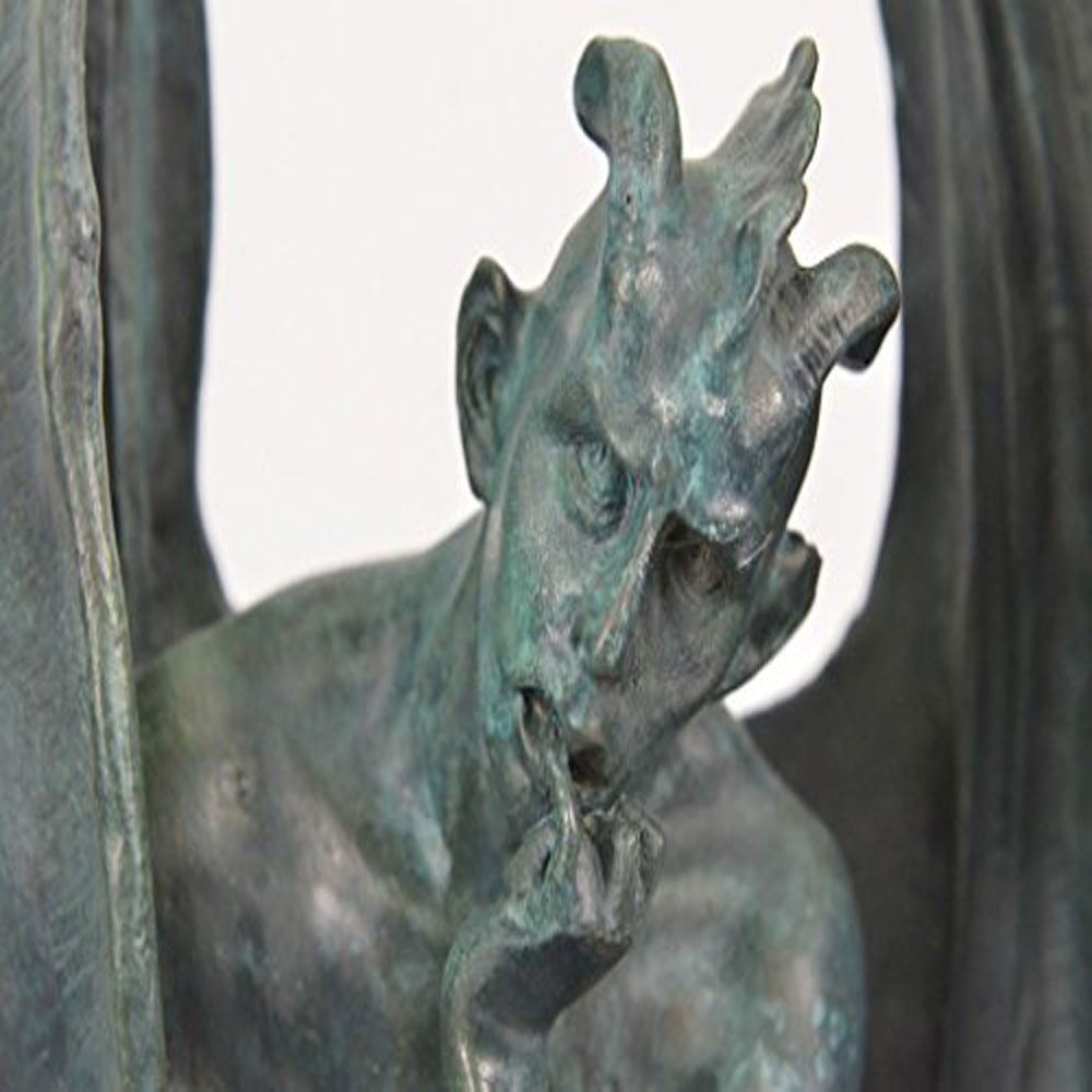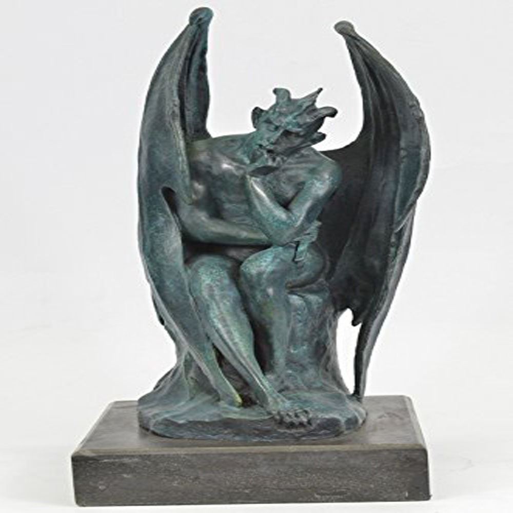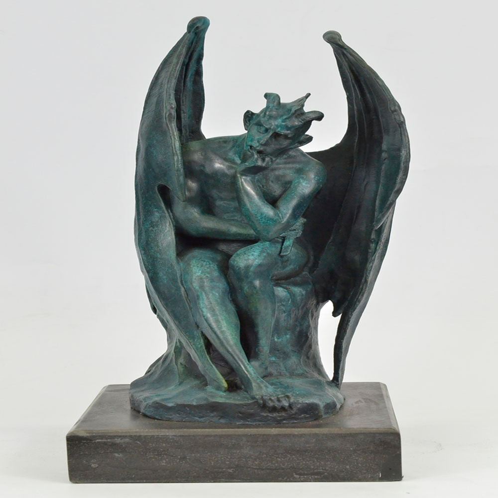 He wraps himself in his wings and holds onto a crucifix while sitting and thinking about his presence in the world. This gargoyle devil has the body of a man but the fingers and toes of a gargoyle. He has horns that grow out of his head with a Mohawk growing down the middle and his facial features are very demonic, like the devil. His wings are not like an angels but the opposite they are similar to a bats wing and have a pointy claw at the top of each wing. This is a beautiful Bronze Sculpture cast using the Lost Wax Method and has a Green patina and mounted on a marble base. Bronze Dimensions with Marble Base: Height 14 X Width 7 inches. Weight: 14 LBS.