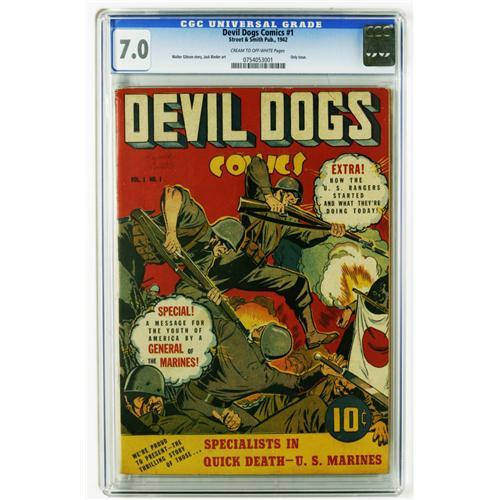 <B>Devil Dogs #1 (Street & Smith, 1942) CGC FN/VF 7.0 Cream to off-white pages.</B></I> Only issue of the title. U. S. Rangers and Marines are featured. Jack Binder art. Overstreet 2006 FN 6.0 value = $87; VF 8.0 value = $164. CGC census 3/06: 1 in 7.0, 1 higher. <I>From the Collection of Harold Curtis.</B></I>