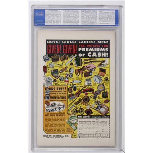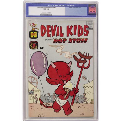 Try finding another copy of this one in high grade! It's the first of a title that ran for two decades, the little devil's third starring series joining <B>Hot Stuff</B></I> and <B>Hot Stuff</B></I> <B>Sizzlers </B></I>(overexposure wasn't a concern, this is <I>Harvey</B></I> we're talking about). Stumbo the Giant stars in a backup story. Overstreet 2006 NM- 9.2 value = $280. CGC census 12/06: 2 in 9.4, none higher.<BR><BR><b>Shipping:</b> Slabbed Comic (<a target="_blank" href="http://www.heritageauctions.com/common/shipping.php">view shipping information</a>)