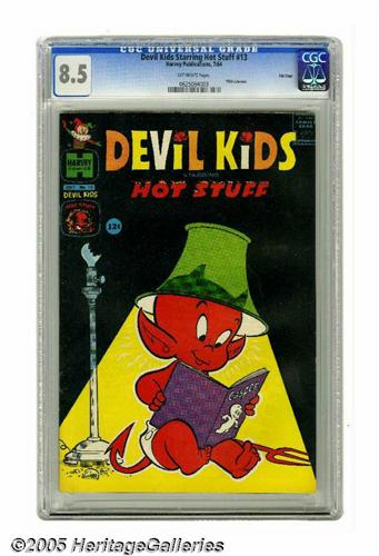 <B>Devil Kids #13 File Copy (Harvey, 1964) CGC VF+ 8.5 Off-white pages.</B></I> Hot Stuff checks out a <B>Casper</B></I> comic on this cover to lucky #13 -- that's one way to advertise Harvey Comics' other supernatural super-star! Overstreet 2005 VF 8.0 value = $33; VF/NM 9.0 value = $44. CGC census 6/05: 1 in 8.5, none higher.