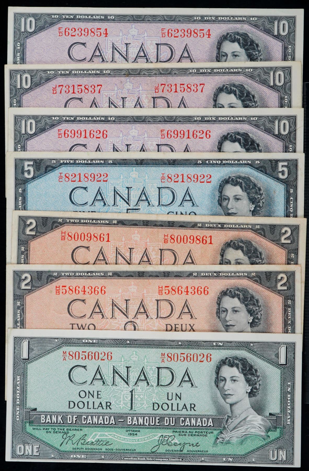 Devil's face Lot; 1954 $1 BC-29b, $2 BC-30b (2), $5 BC-31b, $10 BC-32b (2). Lot of 7 notes with Beattie-Coyne signatures, VF to AU.