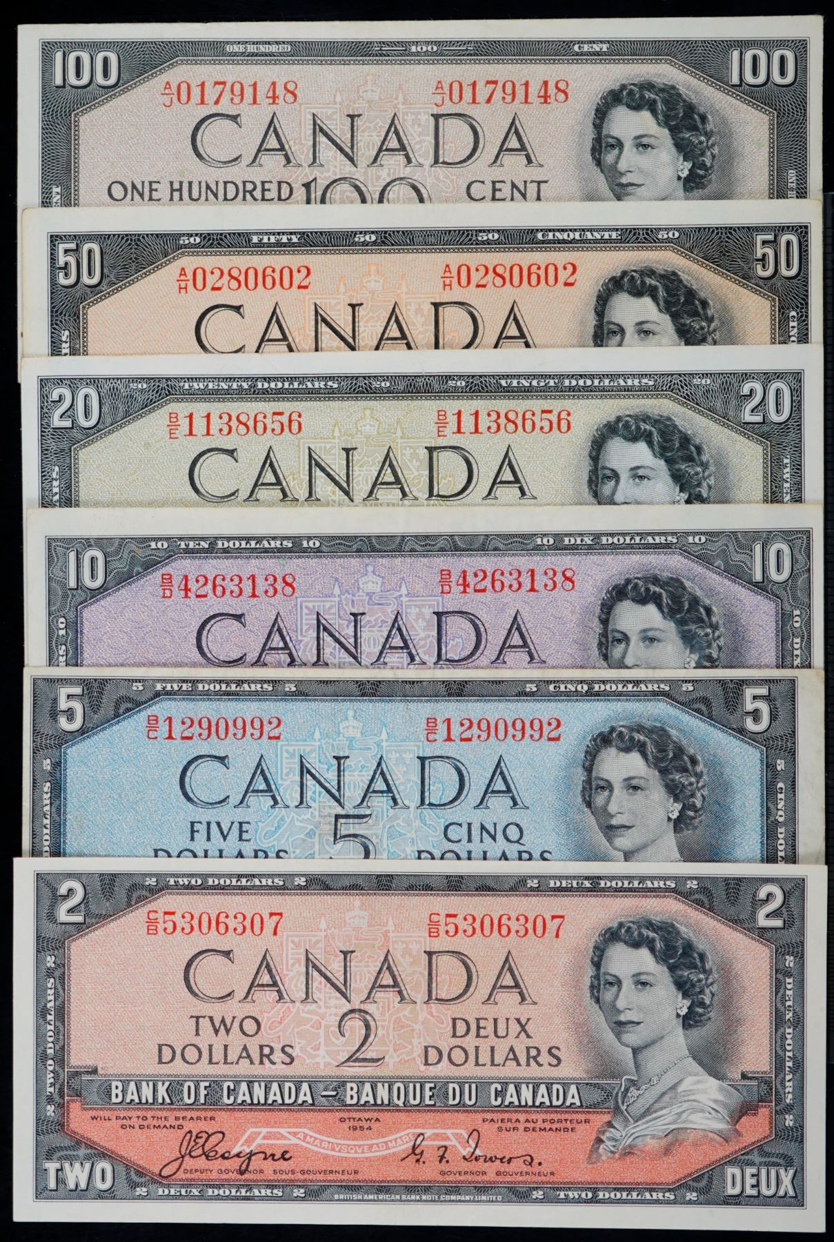 Devil's face Set; 1954 $2 BC-30a, $5 BC-31a, $10 BC-32a, $20 BC-33a, $50 BC-34a Lot of 7 notes with