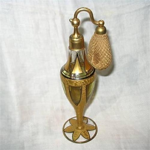 DeVilbiss crystal atomizer with greenish yellow decoration, in excelent condition with original ball. 1930's-1940's.