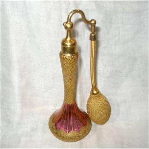DeVilbiss cranberry atomizer, 7 1/2 inches tall, in excelent condition with a new ball and cord. 1930's-1940's.