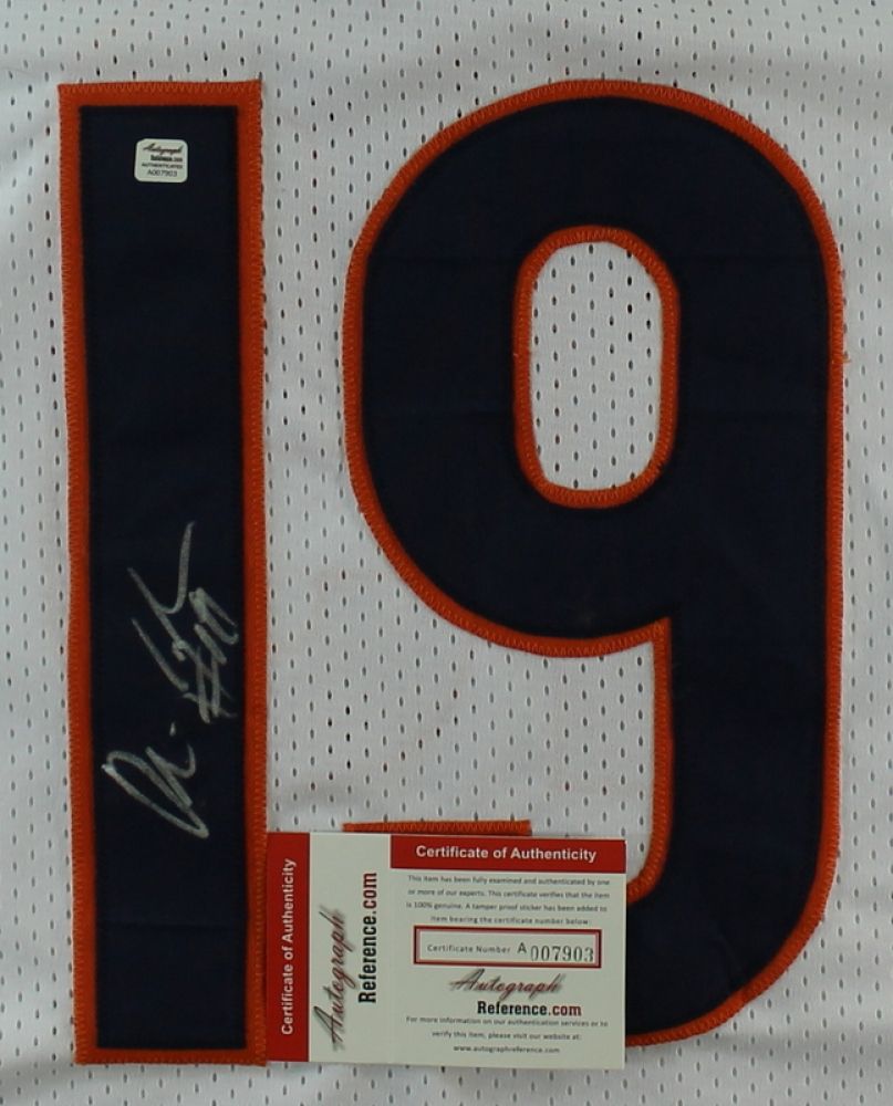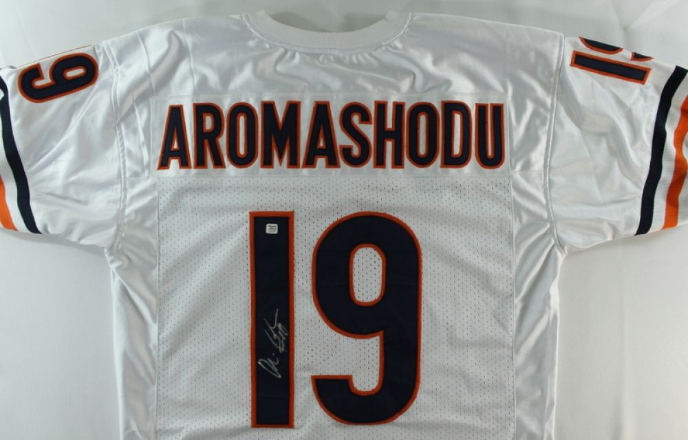 Custom on-field style jersey. Everything is sewn on, size XXL. Hand-signed in silver paint pen by Devin Aromashodu. The autograph includes an official Autograph Reference hologram and matching COA for authenticity purposes.