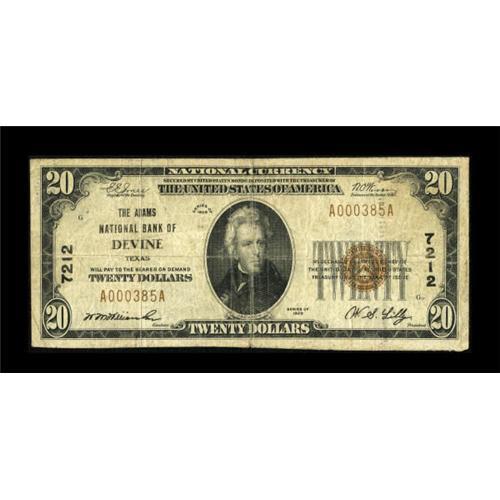 <B>Devine, TX</B></I> - $20 1929 Ty. 1 <B>The Adams NB</B></I> Ch. # 7212<BR> This was the sole bank to issue in this small Medina County location, with Series 1929 examples actually a bit scarcer than their large size siblings. <B>Very Good-Fine</B></I>.<BR><BR><b>Shipping:</b> Coins & Currency (<a target="_blank" href="http://www.heritageauctions.com/common/shipping.php">view shipping information</a>)