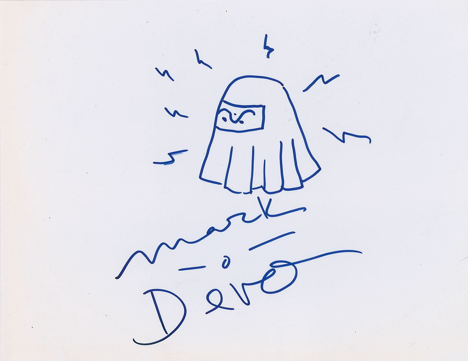 Original sketch by Mark Mothersbaugh of an angry person wearing a niqab, accomplished in blue felt tip on a white 11 x 8.5 sheet of glossy photo paper, which is signed below, "Mark –o– Devo." In fine condition, with a light crease to the lower right corner.