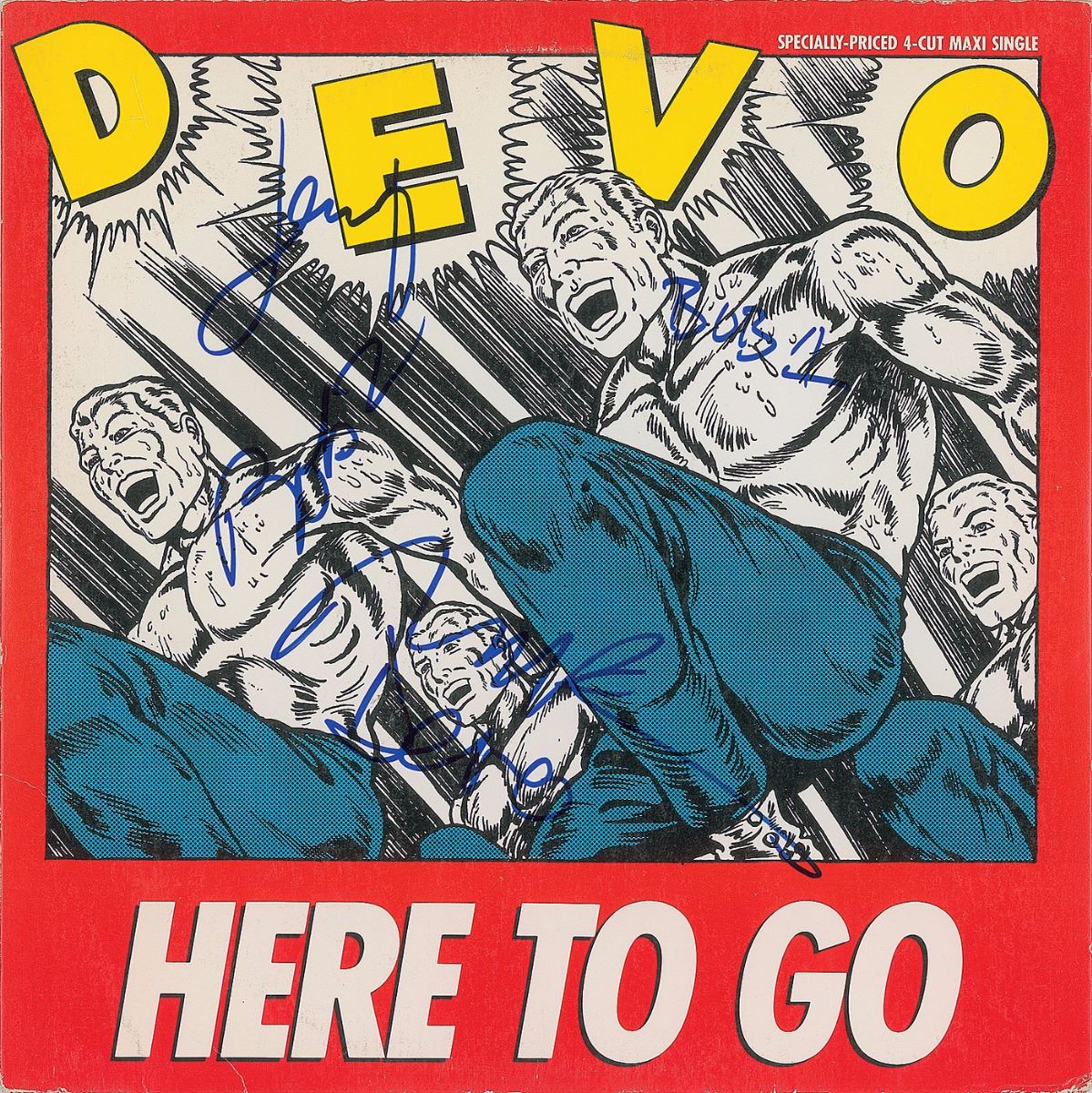 Here to Go album signed on the front cover in blue felt tip by Mark and Bob “1” Mothersbaugh, and Gerald and Bob “2” Casale. In fine condition. The record is included.