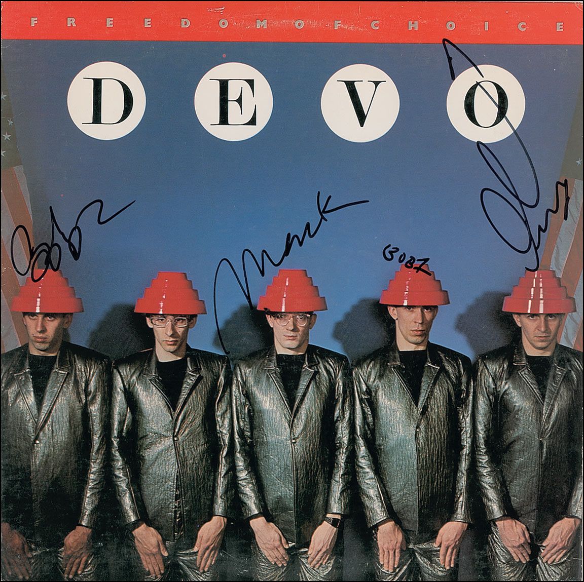 Freedom of Choice album signed on the front in black felt tip by “Bob 1,” “Bob 2,” “Jerry,” adding a doodle, and “Mark.” In fine condition, with light ‘rings of wear.’ The record is included.