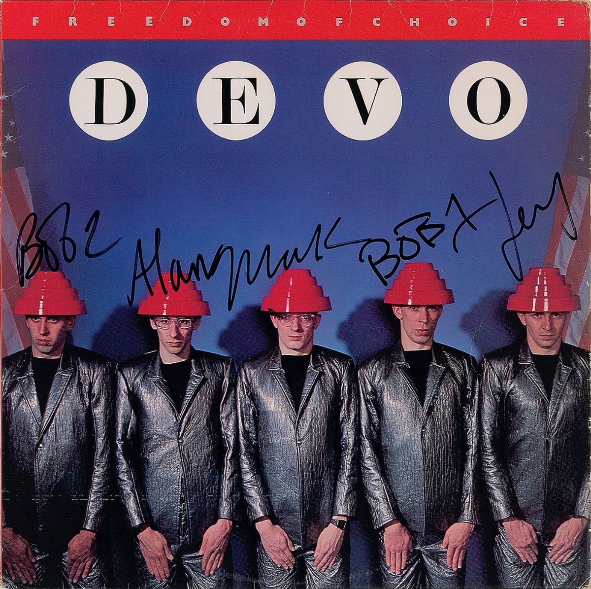 Freedom of Choice album signed on the front cover above their images in black felt by Mark and Bob “1” Mothersbaugh, Gerald and Bob “2” Casale, and Alan Myers, each adding first name only. In fine condition. The record is not included. Accompanied by a full letter of authenticity from REAL.