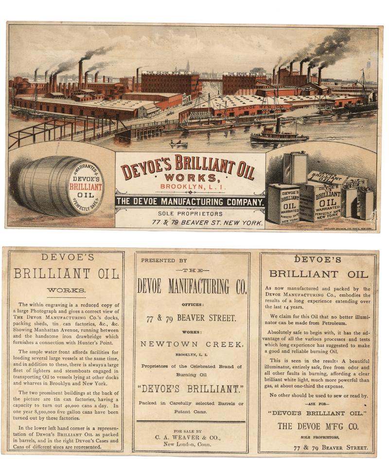 A colorful printed advertising card measuring 9 3/4" x 5 1/2". Detailed depiction of the company's factories. At bottom left and right are various containers in which Devoe's oil was transported. The verso of the advertisement offers a description of the oil works as well as the company's product. Printed by Donaldson Brothers, Five Points, New York. Fine.