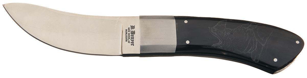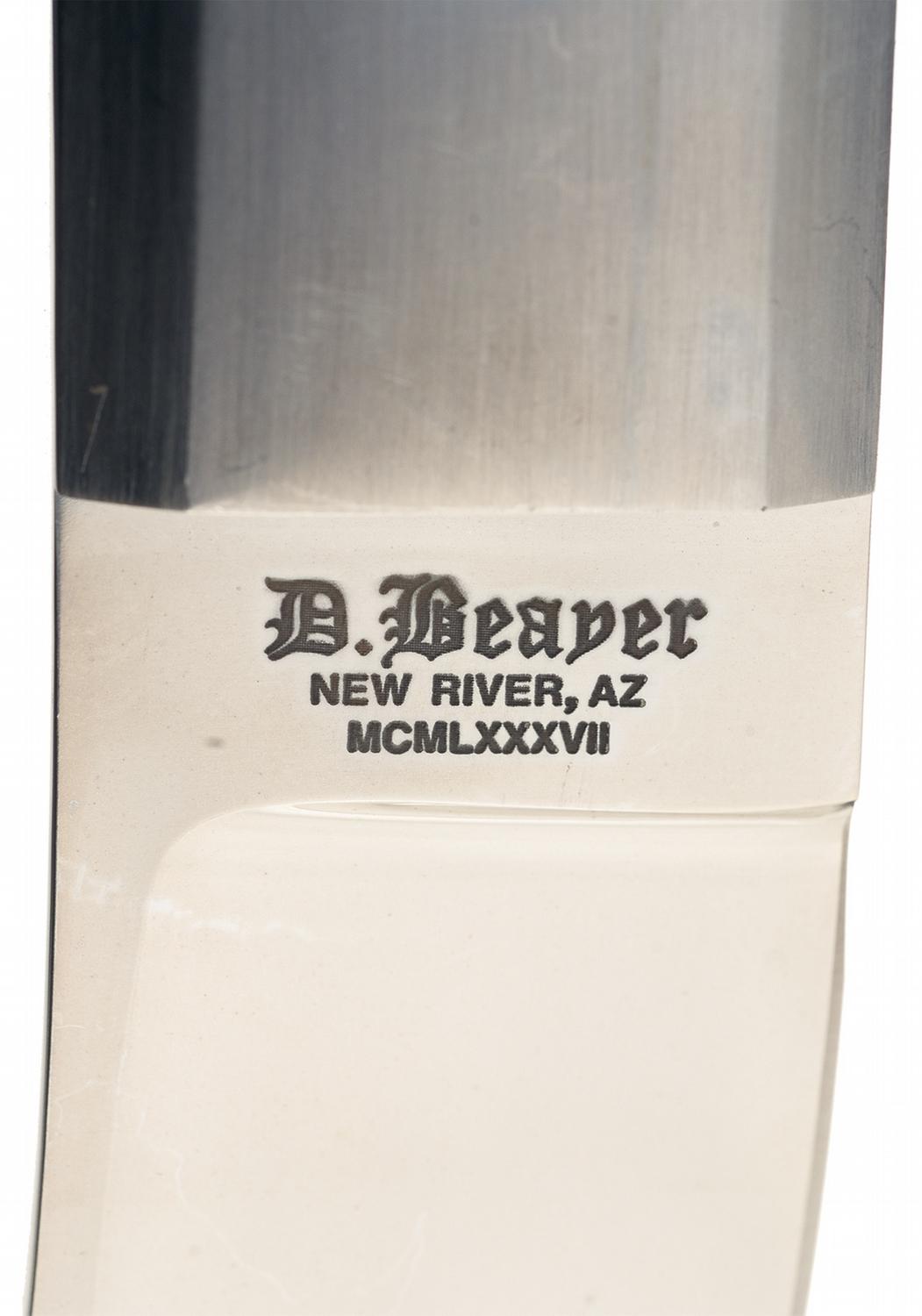 The blade of this custom Devon "Butch" Beaver knife is 3 3/4 inch long with a trailing point and marked "D. Beaver / NEW RIVER, AZ / MCMLXXXVII", the date 1987. Plain bolster, with the top of the tang featuring a scalloped pattern with black background. Fitted with horn scales secured to the tang with four rivets. Scrimshawed rhinoceros head on the left scale. OAL: 8 1/4".