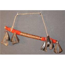 Dew Claw Rattle. Decorated with early red shroud & fiber wrapping. Late 19th century. Displayed in the International Bell Museum in Colorado. 9" long. Estimate $200-$300.
