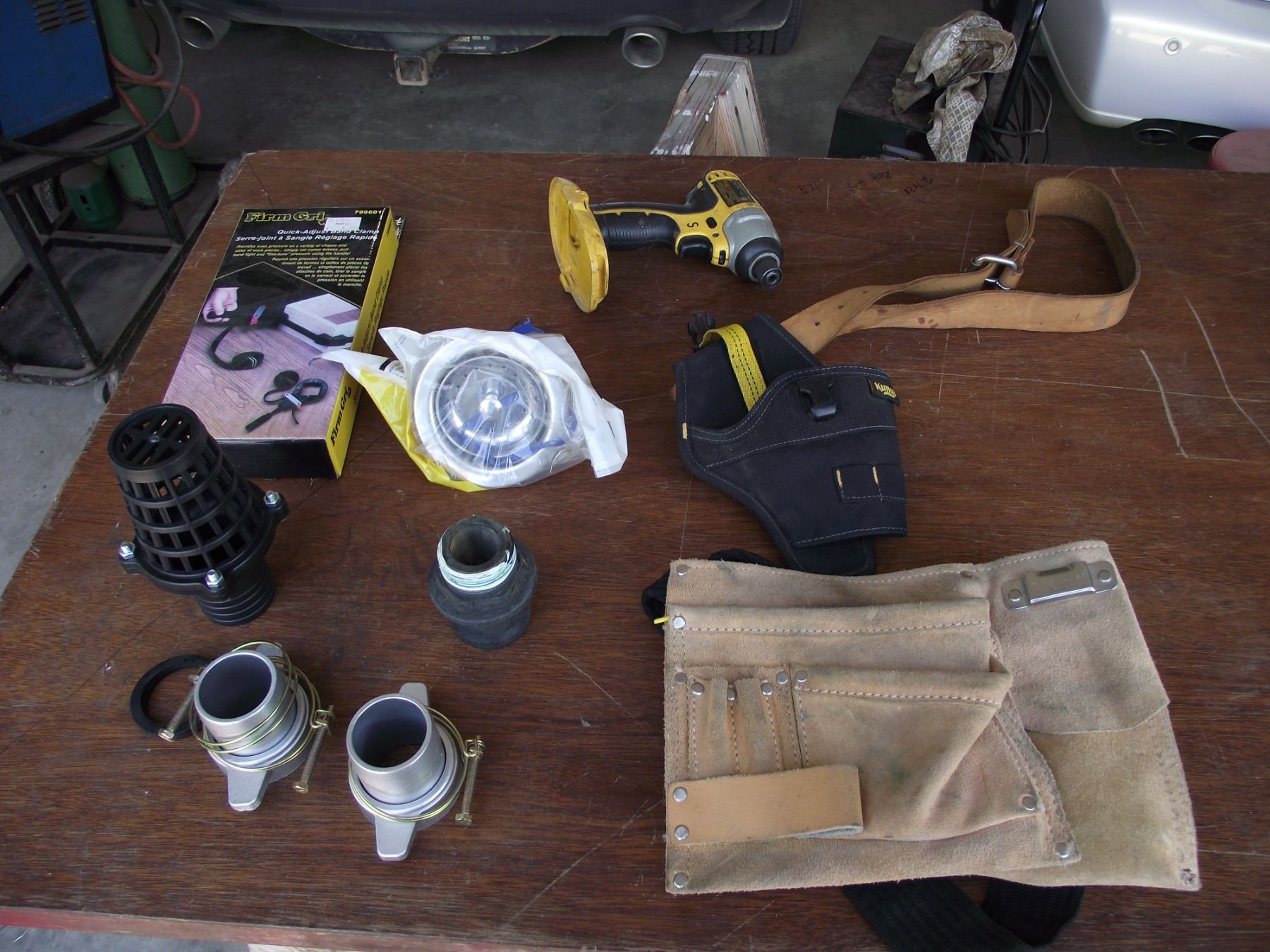Dewalt 18v impact driver (No Battery) and pouch, carpenter pouch, clamp device, sink stop and assorted hose ends.