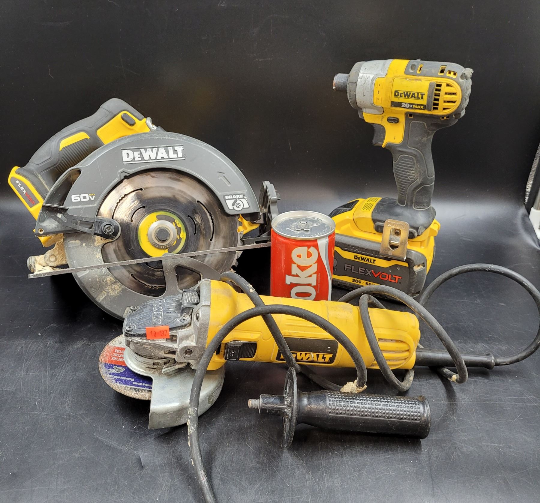Dewalt Circular Saw, Cordless Impact Driver, and Angle Grinder