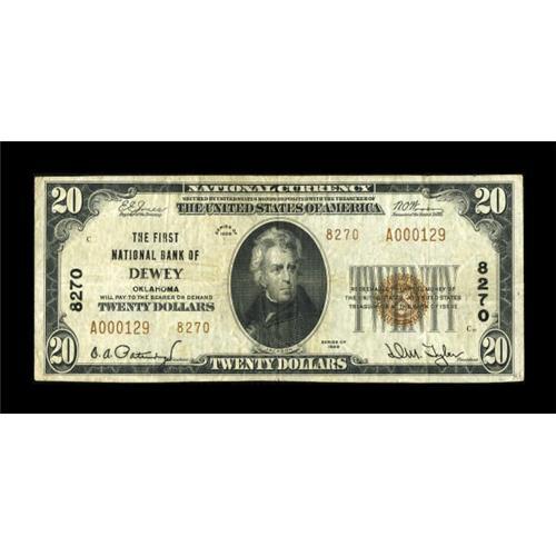 <B>Dewey, OK</B></I> - $20 1929 Ty. 2 <B>The First NB</B></I> Ch. # 8270<BR> A by no means common example which is actually one of the nicer Series 1929 examples reported from here. <B>Fine+.</B></I><BR><BR><b>Shipping:</b> Coins & Currency (<a target="_blank" href="http://www.heritageauctions.com/common/shipping.php">view shipping information</a>)
