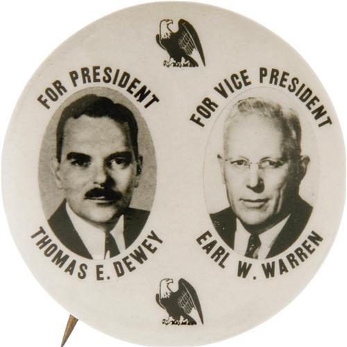<B>Dewey & Warren: 1¼" Jugate Pinback</B></I> by Empress Novelty Co., New York City. This is an exact mate to the Truman & Barkley jugate with black type on a white background. Excellent condition with fresh surfaces and pristine backpaper.<BR><BR><b>Shipping:</b> Miscellaneous Collectibles, Smal (<a target="_blank" href="http://www.heritageauctions.com/common/shipping.php">view shipping information</a>)