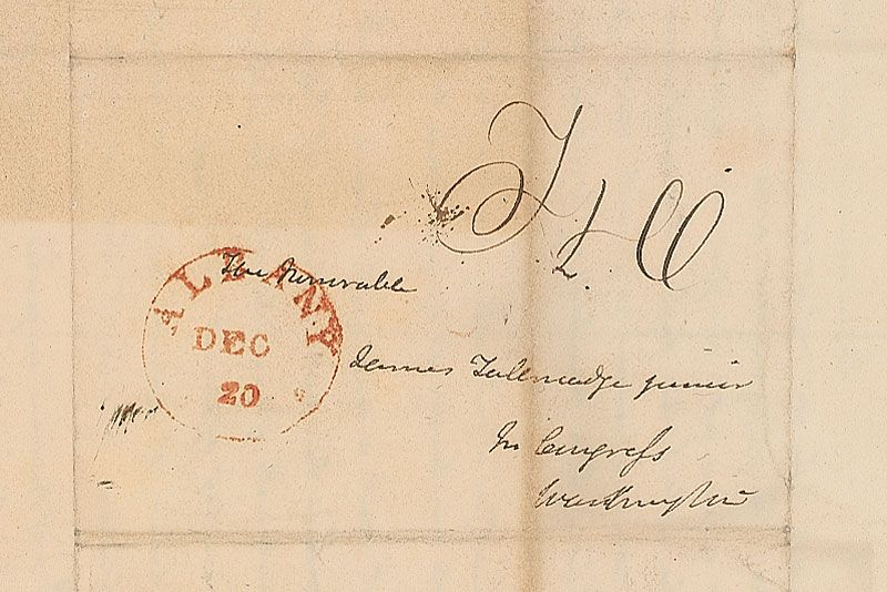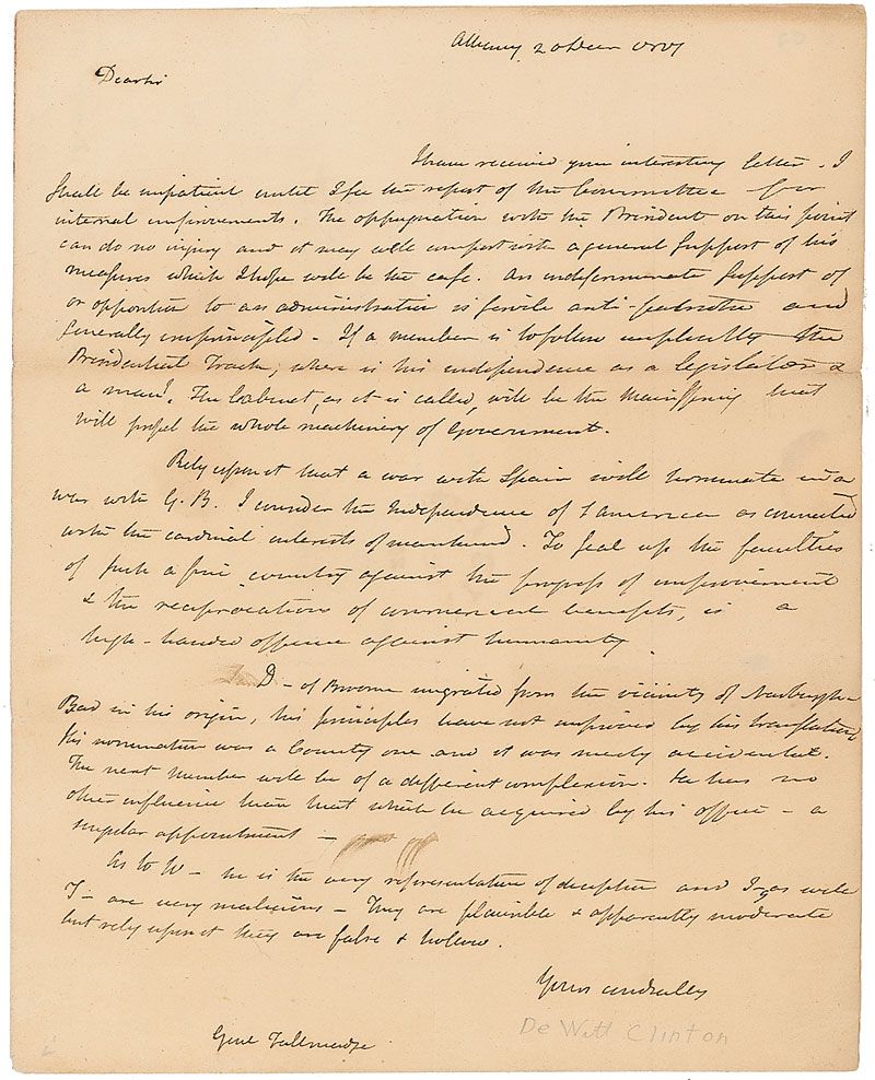 American politician (1769-1828) who served as senator and who, as governor of New York, played a major role in the construction of the Erie Canal. Autograph letter, one page, 8 x 9.75, December 1817. Letter to General James Tallmadge. In part: "An indefinite support of…an administration is…anti-patriotic and generally unprincipled. If a member is to follow implacably the Presidential track, where is his independence as a legislator and a man! The Cabinet, as it is called, will be the main thing that will propel the whole machinery of Government. Rely upon it that a war with Spain will terminate in a war with G.B. I consider the independence of L. America as connected with the cardinal interests of mankind.” Second integral page bears a free franked address panel in an unknown hand. Intersecting folds, Clinton’s name printed in pencil at the bottom, also in an unknown hand, several brushes to text and mild toning, otherwise fine condition.