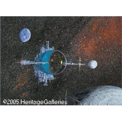 <B>Dexter Dickinson - "Colony Ship" Painting Original Art (1980).</B></I> A colony ship hangs in orbit, between Earth and the moon in this vibrant acrylic on board painting. The image area is 12.25" x 9", and the art is in Excellent condition. <I>From the collection of Richard and Wendy Pini. Richard says: "I didn't always go for the "straight" astronomical scenes -- almost any painting that evoked a sense of the vastness of space or of mysteries yet undreamed was fair game. Dexter Dickinson's imaginary but realistic scenes of what might be in the not-too-distant (I hope) future easily passed the test."</B></I>