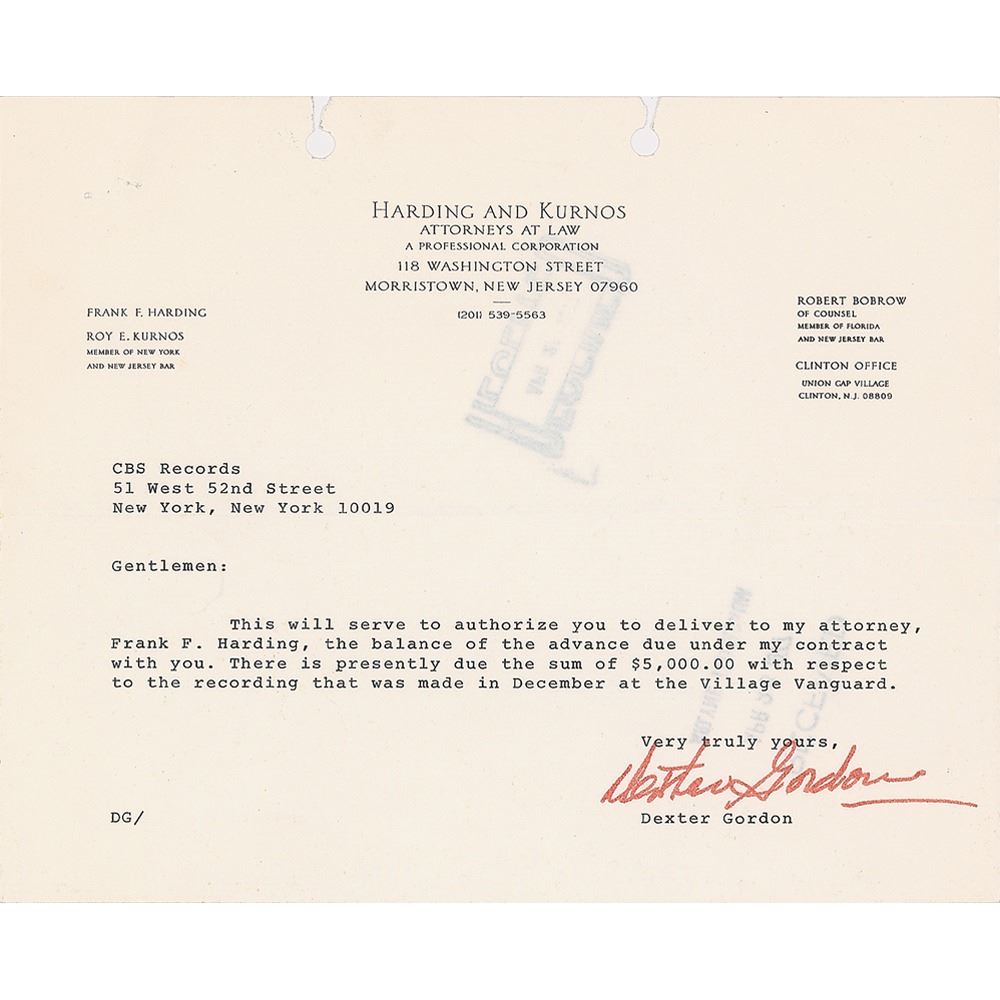 American jazz tenor saxophonist (1923-1990) whose career spanned over forty years. Rare DS, one page, 8.5 x 7, Harding and Kurnos Letterhead, stamp-dated April 28, 1977. Official letter to CBS Records, in full: "This will serve to authorize you to deliver to my attorney, Frank F. Harding, the balance of the advance due under my contract with you. There is presently due the sum of $5,000.00 with respect to the recording that was made in December at the Village Vanguard." Signed at the conclusion in felt tip by Gordon. In fine condition.