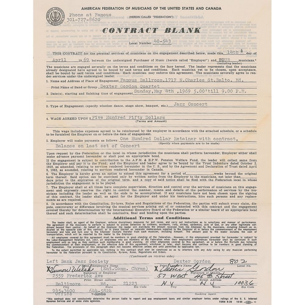American jazz tenor saxophonist (1923-1990) whose career spanned over forty years. Partly-printed DS, one page, 8.5 x 11, April 14, 1969. Agreement for the Dexter Gordon Quartet to perform one jazz concert at the Famous Ballroom in St. Balto, Maryland, for a fee of $550.00. Signed at the conclusion in black ballpoint by Gordon, who adds his address in New York City. In fine condition, with expected light document wear.