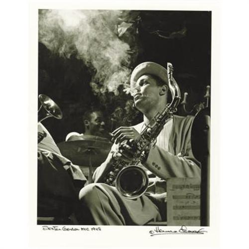 <B>Dexter Gordon Portrait Signed by Photographer Herman Leonard.</B></I> A wonderful b&w 11" x 14" portrait of Jazz saxophonist Dexter Gordon from Herman Leonard's acclaimed series. Leonard's iconic Jazz portraits are well-known and much sought after (sadly, many prints were destroyed by Hurricane Katrina, although most of his negatives were recovered), and this particular print bears the handwritten caption "Dexter Gordon NYC 1948" and Leonard's signature in black ink. It is in Excellent condition.<BR><BR><b>Shipping:</b> Flat Material, Small (<a target="_blank" href="http://www.heritageauctions.com/common/shipping.php">view shipping information</a>)